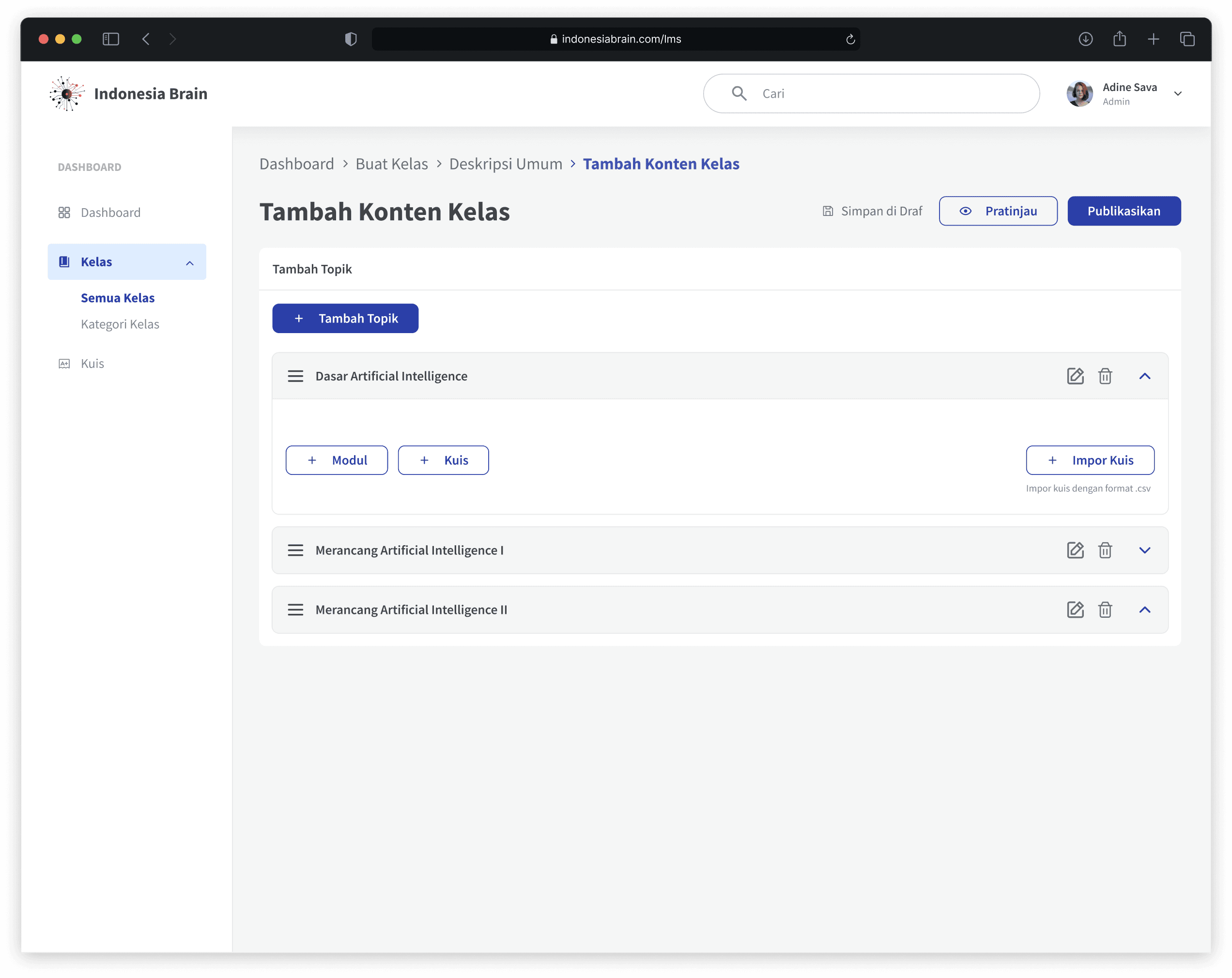 User is able to add new topic. Each topic contains modules and quiz. User is also able to organize the order of each topic through drag button. This makes it easier for users to manage and edit specific sections.